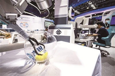 医疗手术机器人展位上,术锐单孔手术机器人正在运用独家蛇形臂进行鹌鹑蛋剥壳“手术”。据展台工作人员介绍,术锐蛇形臂拥有最短7厘米的展开距离,是目前唯一可以实现经后腹膜入路的单孔机器人,开拓了在泌尿外科、儿科、普外科、妇科等多个科室创新应用,为众多病症治疗提供了更微创的手术方案。