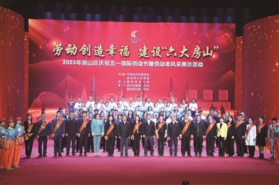 在“劳动创造幸福 建设‘六大房山’”——2023年房山区庆祝“五一”国际劳动节暨劳动者风采展示活动中,分《劳动最光荣》《劳动最美丽》《劳动最幸福》三个篇章,分别对获得2023年全国工人先锋号、全国五一劳动奖章、北京市工人先锋号、首都劳动奖状和首都劳动奖章的集体和个人进行事迹展示和表彰。为表达对全区广大劳动者的崇高敬意,由房山区总工会策划的两首原创歌曲《房山职工有力量》《匠心永驻》在活动现场唱响。