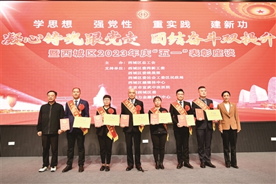 西城区总工会召开了学思想、强党性、重实践、建新功“凝心铸魂跟党,团结奋斗双提升”庆“五一”表彰座谈会。西城区四套班子领导,今年新评选的首都劳动奖状、奖章和北京市工人先锋号代表参加活动,并向全区25万职工同步直播。