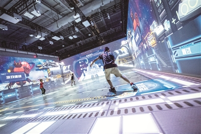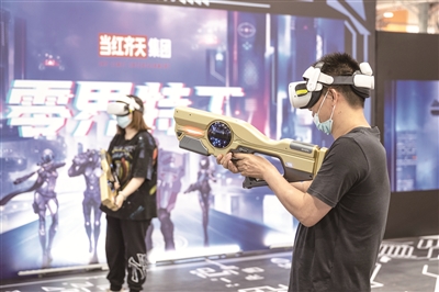 其中,“当红齐天”展区设置了100平方米的VR大空间,一款“零界特工”游戏吸引学生们争相体验。大家戴上VR眼镜,瞬间进入战斗场景,在激烈角逐中感受团队对抗竞技体验游戏带来的乐趣。