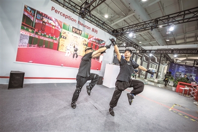 在“数剧京韵”展台,京剧演员穿上带有光学和惯性传感设备的服装,一招一式驱动画面中的京剧人物表演起来。