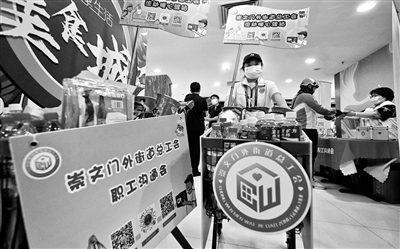5月30日,在新世界商场二期三层漫享时光美食广场门前,横幅、易拉宝海报、宣传彩页以及入会宣传品,吸引了过往食客的注意。不过,这场活动主要服务的对象是外卖小哥。这是东城区崇外街道总工会开展的新业态群体专场职工沟通会。