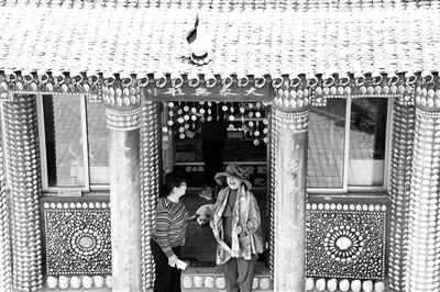 山东省青岛市灵山岛上有一座用各种贝壳装饰而成的“贝壳楼”,该建筑外墙、屋顶以及部分地面均采用贝壳装饰、镶嵌,其覆盖面积约1500平方米。据介绍,“贝壳楼”始建于1986年,历时20多年逐步完善而成。许多游客前来观光打卡。图为游客在“贝壳楼”内参观。新华社发