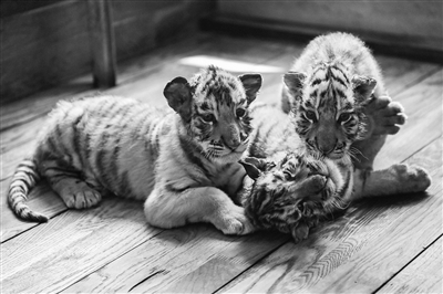 目前,黑龙江东北虎林园今年新出生的东北虎幼崽大部分已满月。这些活泼好动的小东北虎天气好时就会被送到室外活动,在饲养员的悉心照料下茁壮成长。图为东北虎幼崽。
