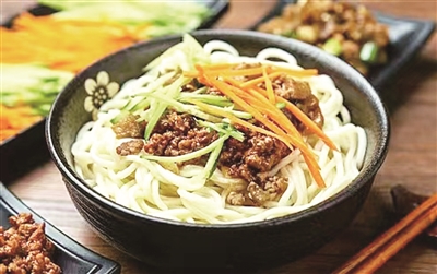 老北京人对面食情有独钟,盛夏时节吃得最多的是面条。特别是喜欢吃过水面,因为这种面清爽利落。所谓过水面,是把煮熟的热面直接放入冷水中过一下,在没有自来水的年代,人们多将热面放入刚刚从井里打上来的凉水中,用笊篱搅上几下就捞到碗里。由于面是凉的,再放上些黄瓜丝、扁豆丝、煮黄豆等菜码,然后浇上调稀了的芝麻酱,再配上点青蒜,捧着一碗凉丝丝的过水面,心中的燥热先去了一半。