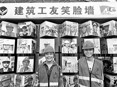 在广东深圳一建筑工地上,两名工人与“建筑工友笑脸墙”合影。“我们要让一线工人把项目当作自己的家。”中建二局一公司龙岗区第三人民医院医技内科楼项目党支部书记孟金龙表示,“建筑工友笑脸墙”展示了工人风采,体现了企业对工友的人文关怀。据介绍,“笑脸墙”为规范一线工人的安全防护起到了良好的示范作用。照片里,工人们都按要求穿戴好防护用品,在潜移默化中促进了安全教育。(6月16日《工人日报》)