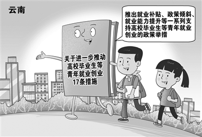 云南省政府办公厅近日印发《关于进一步推动高校毕业生等青年就业创业17条措施》,推出就业补贴、政策倾斜、就业能力提升等一系列支持高校毕业生等青年就业创业的政策举措。(7月1日 新华社)□朱慧卿