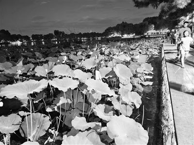 昨天傍晚时分,市民漫步在西海沿岸观赏荷塘月色。时下正值赏荷最佳时节,朱自清笔下描绘的“荷塘月色”在西海湿地公园美景重现,市民漫步在浮桥之上,穿行于荷塘之间,别有一番韵味。本报记者 孙妍 摄影报道