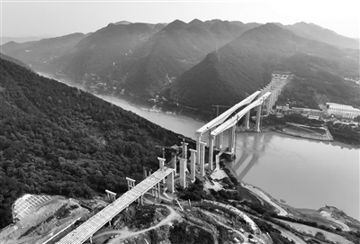 连日来,重庆渝武高速公路复线控制性工程观音峡嘉陵江特大桥引桥T梁架设全面展开,预计今年内全桥可实现贯通。观音峡嘉陵江特大桥位于重庆市北碚区,大桥主跨235米。图为施工人员在架设引桥T梁。 新华社发