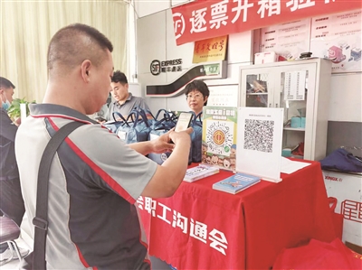 昌平区城南街道总工会联合北京银行,近日来到辖区顺丰快递投递点开展快递小哥专场沟通会。沟通会上,快递小哥使用“北京工会i会员”小程序扫码入会,工会工作人员使用电子设备移动端审核,北京银行工作人员现场为职工办理工会会员互助服务卡,实现工会“一站式”服务。本报记者 周美玉 摄影报道