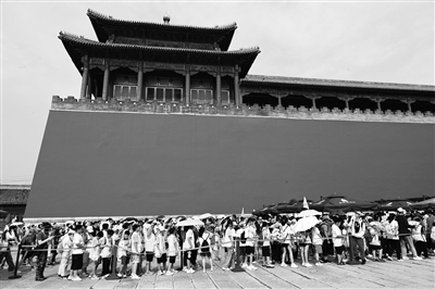7月20日,未成年人团队排队等待进入故宫。为应对暑期客流高峰,北京故宫博物院开始受理未成年人团队预约参观申请,对未成年人占85%以上的暑期未成年人团队开放快速预约和入院通道。为了保障参观安全和参观质量,故宫要求团队的未成年人不能超过30人、成年人与未成年人比例不得低于1∶10、总人数不得超过35人。