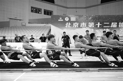 北京市第十二届拔河比赛近日在地坛体育馆举行,全市各区、各企事业单位选派的30支拔河队约400人参加了本次比赛。比赛中,各参赛队伍斗志昂扬,队员们铆足气劲,拉紧赛绳,齐力奋战,团结协作,寸绳必争。本报记者 彭程 摄影报道