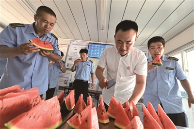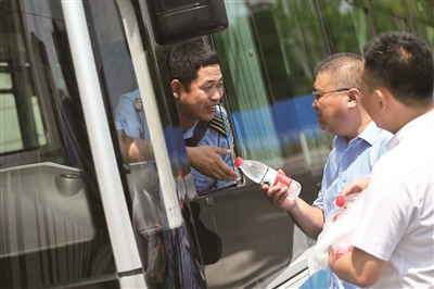中午11点,刚结束运营的865路公交车驾驶员刘国民来到了职工休息室。“刘师傅,快来吃西瓜,冰镇的。”北京公交集团客五分公司第八车队管理人员,为职工们准备了防暑降温的西瓜,在炎热的夏季带给大家清凉。自6月起,客五分公司各级工会开展了以送清凉物资、送政策宣传、送健康防护指导为主要形式的“送凉爽”活动,走进站台、车厢、场站、职工休息室,将西瓜、菊花茶、饮料、雪糕等清凉物资送到职工手中。