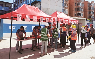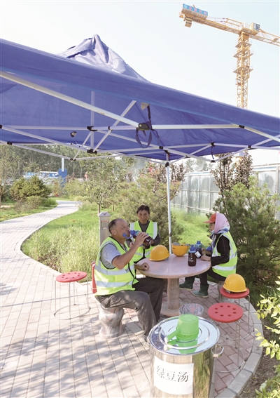 搭起凉棚,开启喷雾,宿舍24小时空调,全时段绿豆汤供应,防暑降温药品一应俱全……高温天气里的北京市大兴区建设集团有限公司青云店安置房项目工地现场,随处可见防暑降温措施。“这瓜又甜又脆,吃完真痛快!”工作日的每天下午三点,凉棚下,工人们吃着西瓜,喝着绿豆汤,有说有笑。待烈日逐渐变弱,工人们才开始下午的工作。赶在伏天,这样的避暑场景成为大兴建设集团各个项目工地上的常态。工友们也发自内心爱护这个“消夏小窝”,有些工友会自带纸板垫在凉棚的通道上,以免鞋底的泥土等粘在地面上。为了给在高温下作业的工人们增添一份清凉,大兴区建设集团工会总是把清凉物资第一时间送进工地现场,并叮嘱项目负责人一定要把防暑降温措施做实做细,切实关心职工身体状况和精神状态,把防暑降温和安全生产有效统一起来,确保平稳度夏。