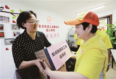 近日,朝阳区安贞街道总工会为在辖区内公交和地铁站台上的公共文明引导员送去矿泉水等饮品。慰问中,该街道总工会主席李咏梅详细询问了文明引导员的工作和身体状况,并叮嘱他们在做好志愿服务的同时注意安全。本报记者 刘欣欣 通讯员 史超齐 摄影报道