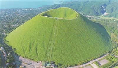 中午时分,我们来到景区门口买票后乘缆车上山。缆车沿着山坡缓慢上升时,我发觉距离坡面的高度一直保持在1米左右,头顶上是一片蔚蓝的天空,缆车下方是整齐的绵绵苍翠,海风亲抚面颊,晃晃悠悠间有种荡秋千之感。女儿在旁边开始了导游解说:“地处伊豆高原的大室山位于静冈县东部,海拔580米,是一座休眠火山。据说4000年前曾有火山喷发,使大室山呈圆锥体模样,鸟瞰起来像个大‘抹茶蛋糕’。”