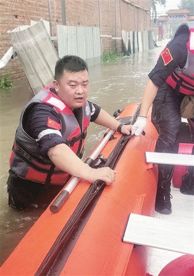 照片中手扶橡皮艇、脚踩深水处的救援队员,是来自北京经济技术开发区综合执法局的工作人员贾春华。8月2日至3日,贾春华随北京红箭应急救援队前往河北涿州开展救援行动,这也是他自加入救援队以来第二次参加抢险救援行动。