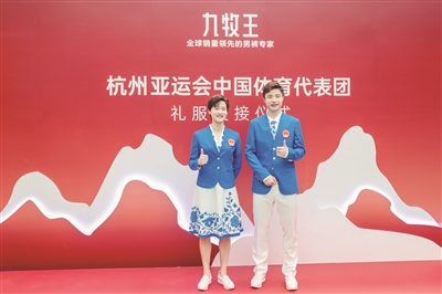 近日,中国羽毛球运动员陈雨菲(左)和石宇奇试穿礼服。当日,杭州亚运会中国体育代表团开幕式礼服“星耀”交接仪式在北京举行。