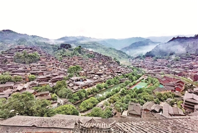 在群山环抱之中,西江苗寨好似天宫仙境一般,缓缓映入眼帘,一座座漂亮的木质吊脚楼依山而建,层层相叠,鳞次栉比。一条清澈见底白水河九曲十弯,汩汩流淌,穿寨而过;一个个身着苗族服饰的青年男女悠然自得,有说有笑,徜徉在熙攘的古镇小街上。