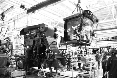 近日,山东省潍坊市的农机企业生产繁忙,迎接即将到来的秋收农机需求高峰。图为潍柴雷沃智慧农业科技股份有限公司工人在车间组装生产大型农机设备。新华社发