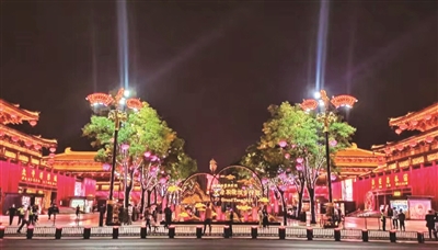乘车而行,不多时便来到位于西安古城外东南部大雁塔下的“大唐不夜城”。它以盛唐文化为背景,以唐风元素为主线,以大雁塔为映衬,以斑斓光影为夜景,为唐文化展示和体验之地。