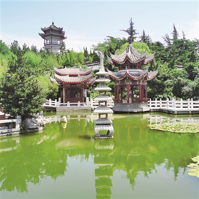 来到山后,你会看到一组江南古典园林风格的建筑群,这里有一座瑶池园,园中以瑶池、假山为主构成一水系,周围有竹城、紫霞厅、茗香轩、兰蕙舫、倚山楼、邀月亭、鸳鸯亭、曲桥等建筑,由游廊连为一体。漫步园中,看那园中一池春水,绿波微荡,鱼戏荷间,好不快乐,水中倒映着亭台楼阁、轩榭廊舫,倘若在此小憩一番,可能会有“翰玉宇琼楼记起千年传说,借瑶池云海来当半日神仙”的感触。当天,偶遇一对才子佳人,身着礼装,牵手拍照。