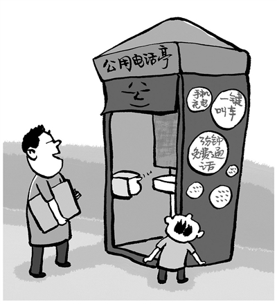 开放式设计、红黑色调搭配,配置“一键叫车”“12345手语服务”“一键通”等功能……这样富有时尚感和现代感的描述,你可能无法想象,勾勒的是上海新一代公用电话亭的全新形象。随着手机的普及,公用电话亭这一曾经遍布城市街头的设施几乎快要被市民遗忘了。近段时间,记者在上海街头采访时发现,公用电话亭带着一系列新功能焕新回归。(9月12日《经济日报》)□王铎