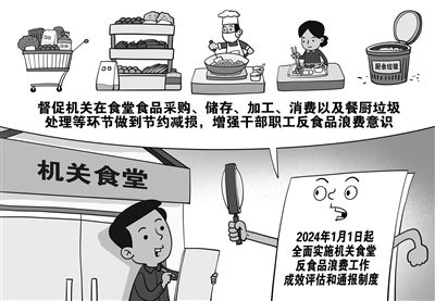 制止餐饮浪费是一项长期任务。国管局、国家发展改革委、商务部、市场监管总局近日联合印发通知,决定自2024年1月1日起,全面实施机关食堂反食品浪费工作成效评估和通报制度,督促机关在食堂食品采购、储存、加工、消费以及餐厨垃圾处理等环节做到节约减损,增强干部职工反食品浪费意识。(9月14日 新华社)□朱慧卿
