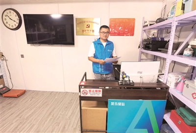 穿过货架,走进陈著的菜鸟驿站办公室,一间大约十平方米的小屋干净整洁。储物架上整齐码放着各种便民服务设施:微波炉、饮水机、打气筒、针线盒、急救箱、维修工具包和消防应急箱……居民们平时有“小修小补”的需求都来找陈著帮忙,便民箱已化身“百宝箱”。菜鸟驿站中配备了24小时热水和免费矿泉水,社区周边的环卫工人偶尔也会来这里歇脚。采访中,不时有居民来到菜鸟驿站收发快递,陈著待人接物总是笑脸相迎,亲自为长辈取件、发件。