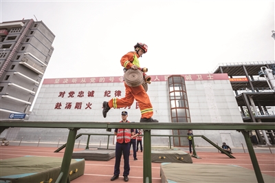 本届竞赛设置灭火救援员、森林消防员、消防通信员、搜救犬训导员、消防装备维护员、消防设施操作员6个竞赛项目,共20个比赛模块。当天,率先上演的是灭火救援员竞赛项目,现场设置了100米消防障碍、攀登挂钩梯、救援技能3个比赛模块。在攀登挂钩梯科目中,队员如同敏捷的“蜘蛛侠”,利用挂钩梯飞速爬上训练塔的四楼,该项目重在考验队员的身体爆发力、协调能力和核心力量。