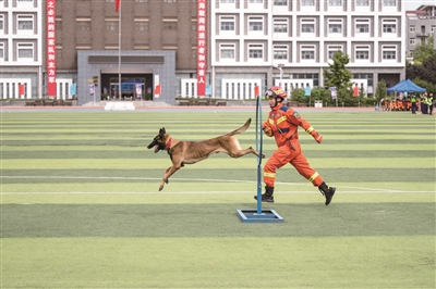 搜救犬训导员竞赛项目检验搜救犬的体能、服从力、专注度、嗅觉敏感性等综合能力,更考验训导员能否做到“人犬合一”,在最短时间内完成“搜救”。消防通信员竞赛项目设置了无人机侦察投送、无人机航拍建模、现场通信保障3个比赛模块,19支参赛队伍激烈比拼,各自展现出消防最强实力。