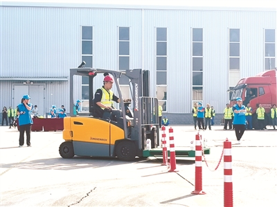 据了解,为弘扬工匠精神,搭建职工技能展示平台,此次竞赛以实操考试的形式进行,考核项目为绕杆运货加塑拍码放,主要考核参赛职工操作时的安全性、熟练性、稳定性等。“记时精确到百分之一秒,采用秒表记时,选手最终成绩根据完成时间和违规处罚时间综合计算。”工作人员介绍,“这项操作看着简单,实际需要选手精确操作,需要细心的计算、调整物品角度以及高超的驾驶技巧和平衡能力,考验的是选手对叉车转弯、角度等技能的把握。”