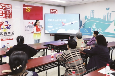 近日,北京首都机场航空安保有限公司组织青年志愿者前往大兴区榆垡镇居民社区服务站,开展“民航安检知识公益科普”活动,青年志愿者为当地居民介绍乘机流程和民航安检禁限带物品知识,提升社区居民安全乘机出行意识。通讯员 赵振龙 摄影报道