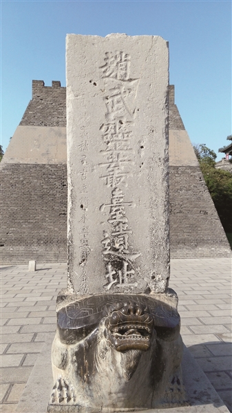 由丛台北门沿着用砖和条石铺成的踏道,步步登高跨过门槛,迎门而立的碑刻,正面刻有清代乾隆皇帝的一首律诗《登丛台》,背面是他的古风《邯郸行》词,诗词均赞颂了赵武灵王胡服骑射的历史功绩。