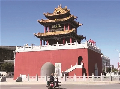 经过县城中心时,一座红墙黄瓦的建筑格外壮观,但见上悬“玉皇阁”之额,于是停车观看。向路边的一位老者询问后得知这是定边的标志性建筑——鼓楼,原名玉皇阁,坐北向南。初建年代无考,明清时多次修葺。为重檐十字歇山顶,三滴水三层砖木结构建筑,高30米,为省级重点文物保护单位。