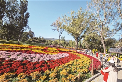 昨天,四面八方的游客走进国家植物园踏秋赏花,观赏园中进入盛花期的菊花,数万盆各色小菊组成了不同的色带色块,形成了五彩斑斓的花海,让人流连忘返。