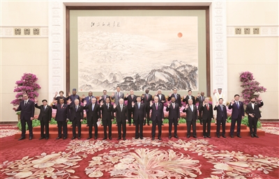 在《和平-命运共同体》乐曲中,习近平同外方领导人一同步入会场。全场起立热烈欢迎。