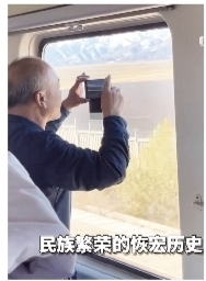 10月15日,甘肃。火车途经张掖火车上的乘客纷纷用手机记录祖国的大好河山,一位大爷被祁连山山景触动,一边用手机记录壮阔的美景,一边饱含深情即兴朗诵。