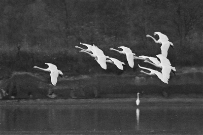连日来,在山东省荣成市天鹅湖,天鹅沐浴晨光,与湖光山色构成诗情画意的美景。图为天鹅在山东省荣成市天鹅湖水面上飞翔。 新华社发