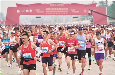 昨天上午7时30分许,2023年北京马拉松暨全国马拉松锦标赛(北京站)鸣枪起跑,3万余名选手从天安门广场出发,在奔跑中享受运动的快乐,欣赏沿途城市风光,比赛终点是奥林匹克公园景观大道。(相关报道详见第8版)