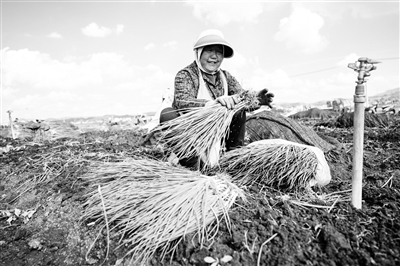 近年来,云南省昭通市鲁甸县通过发展香葱产业带动卯家湾安置区搬迁群众及当地农民在家门口就业增收。2022年鲁甸县香葱产量达6.67万吨,销售收入达3.05亿元。香葱产业成为助力群众稳定增收的富民产业。图为农民在鲁甸县一处香葱种植基地内整理香葱。 新华社发