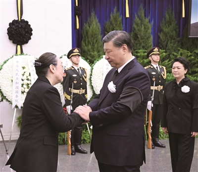 上午9时许,习近平和夫人彭丽媛,李强、赵乐际、王沪宁、蔡奇、丁薛祥、李希、韩正等,在哀乐声中缓步来到李克强同志的遗体前肃立默哀,向李克强同志的遗体三鞠躬,并与李克强同志亲属一一握手,表示慰问。胡锦涛送花圈,对李克强同志逝世表示哀悼。