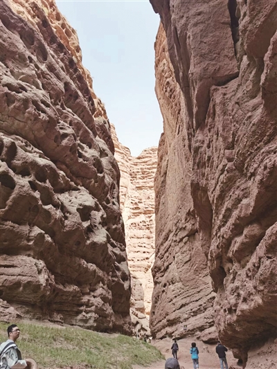 那天,我们乘坐景区观光车,抵达大峡谷入口。这是一条幽深的峡谷,两边峭壁耸立,羊肠小道蜿蜒曲折。抬起头来,你会看到前方的山体不同寻常,仿佛是用利剑劈过之后在其剖面上又雕刻出了层层的波纹。当我站在谷底时,深感自己的渺小,仿佛自己成了丹霞山脉中的一粒石子。