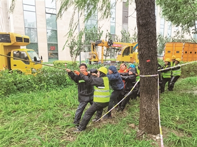 汛情就是命令,防汛就是责任。7月31日,由于强降雨,群众反映北京市政务服务中心六里桥附近高大乔木倒伏,存在安全隐患,丰台区园林绿化局党组书记刘立宏立即带领抢险突击队队员冒雨赶往现场处置。他在现场边抢险边对大家说:“大汛就是‘大考’,面对汛情险情,我们园林职工有激情热情,居民百姓的需求就是我们园林职工的最大动力,我们一定筑牢防汛‘堤坝’,守好绿色生态空间。”