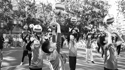“孩子们喜欢运动,课间时老师尽量让孩子离开教室,哪怕在楼道里活动都好。天气好的时候,大部分孩子愿意去操场走一走,跑一圈再回去也高兴,这就是孩子的天性。”北医附小校长田国英介绍,牡丹园校区操场狭小,学校将其划分出多个区域,比如中间设为手脚爬行区,专供低年级学生;边角有毽子区、沙包区、跳房子区,还有排球颠球区。花园路校区有两个操场,可以把高低年级学生分开活动,比如一年级用小操场,乒乓球和羽毛球区给五年级,西边篮球场给六年级等等。楼道也被利用起来,可以组织学生们玩翻绳等微运动。