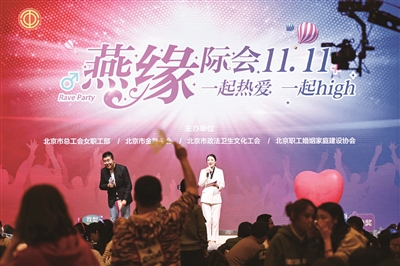 11月11日,由北京市总工会女职工部、北京市金融工会、北京市政法卫生文化工会、北京职工婚姻家庭建设协会联合举办的11.11单身职工特别活动——“燕缘际会 11.11一起热爱 一起high”上,300位单身职工展示自我、邂逅爱情、寻找心中的那个他/她。北京市总工会党组成员、副主席赵丽君出席并宣布活动启动。