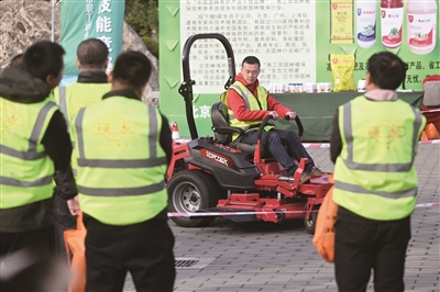 轻轻向前推送操作杆,草坪车就丝滑地向前行驶;向后拉动操作杆,草坪车立刻开始倒车;单侧拉动操作杆,草坪车就可以转弯……在2023年北京市职工职业技能大赛园林机械技能竞赛现场,草坪修剪、绿篱修剪、高枝锯木及落叶收集全部通过新型的机械设备轻松完成,考验选手的不仅有园林修剪的思路,还有对机器设备使用的熟练程度。现场,选手不但要了解秋冬季园林植物的修剪与保护,还要懂得药械在园林病虫害归类简化防治中的应用、园林养护机械的分类维护及应用;不但要会操作机械,更要懂得园林绿化机械操作包括安全、操作、维护保养以及冷却液、润滑油、润滑脂、燃油等燃润料知识在内的相关知识。