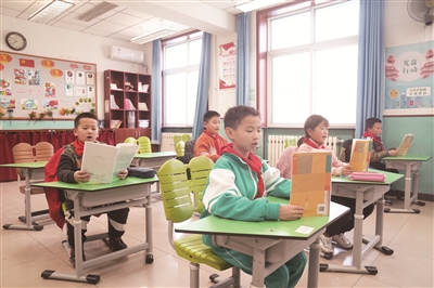 昨天上午,门头沟区大台中心小学三年级学生在老师带领下朗读课文。当天,门头沟区大台中心小学及附属幼儿园恢复原址教学,96名师生重返校园。“感恩”和“立志”成为返校第一课的主题词。