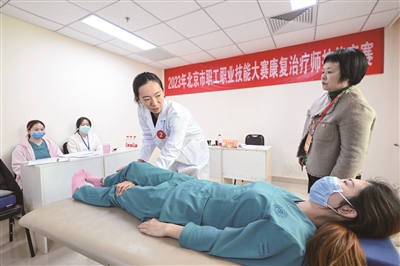 “我先给您的腿部稍微活动一下,检查关节活动是否受限,此过程中如果出现不适请及时告诉我。”近日,在首都医科大学附属北京康复医院医学院楼内,2023年北京市职工职业技能大赛康复治疗师(物理治疗方向)技能竞赛决赛如火如荼地展开。25名选手激烈角逐,展现扎实的专业知识和精湛的操作技能。