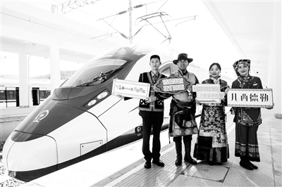 11月26日,丽江至香格里拉铁路开通运营,两地间最快1小时18分可达,昆明经大理、丽江可直达香格里拉。图为乘客和铁路工作人员在丽香铁路开通首发列车前合影。 新华社发